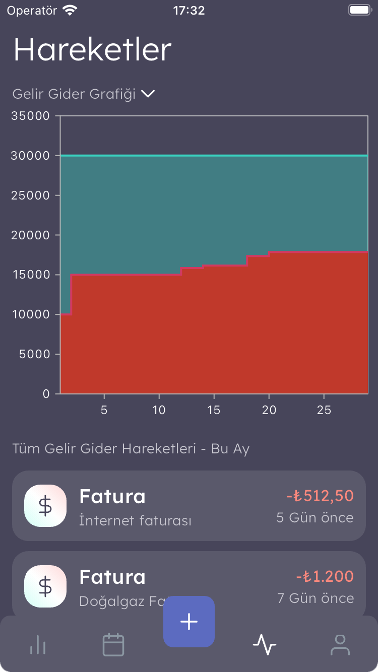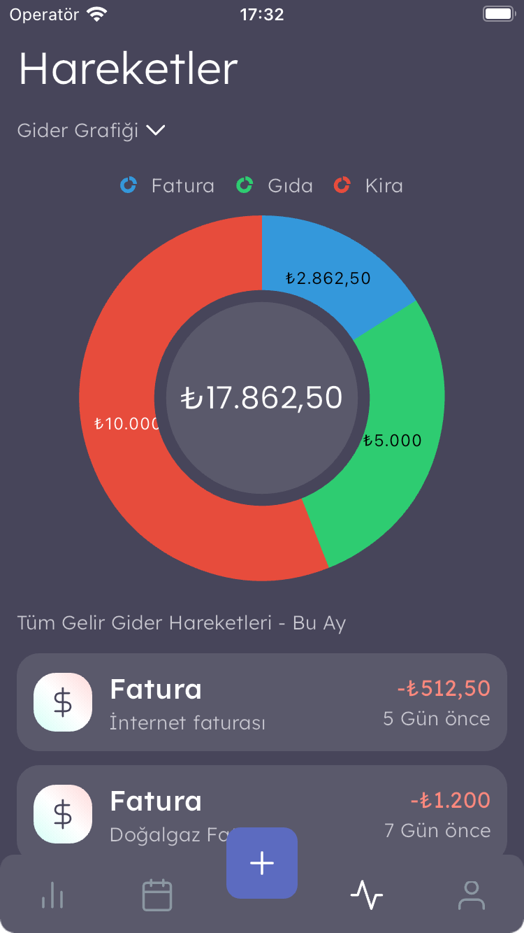 Gelir ve giderlerinizi detaylı grafiklerle görselleştirin, her harcamanızı ve kazancınızı gün gün izleyin. Hareketler sayfasında aylık gelir-gider analizleriyle finansal hikayenizi keşfedin. Takvim sayfasında geçmişe ve geleceğe dönük planlarınızı yapın. Bütçe sayfanızda gelir ve giderlerinizi kategorize edin. Finansal başarıya giden yolda adım atmak için şimdi ücretsiz deneyin!